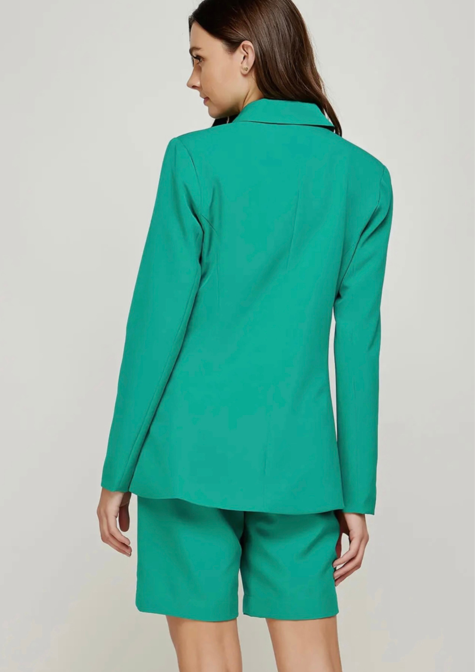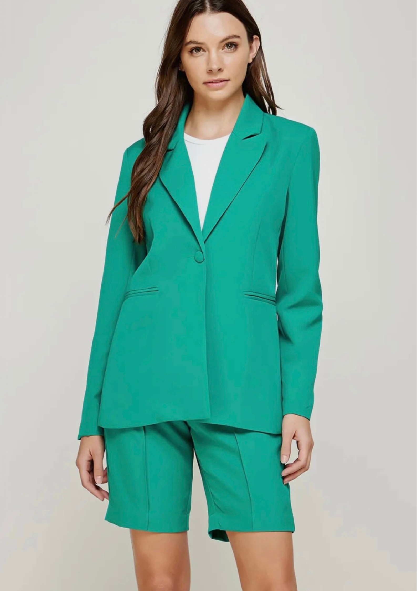 Set of blazer and Bermuda shorts in stretch crepe fabric. This relaxed blazer is lined for comfort and features peak lapel, long sleeves, and jetted front pockets with 2 button front closure. The Bermudas feature pintuck front detail button and zipper fly closure and side pockets.