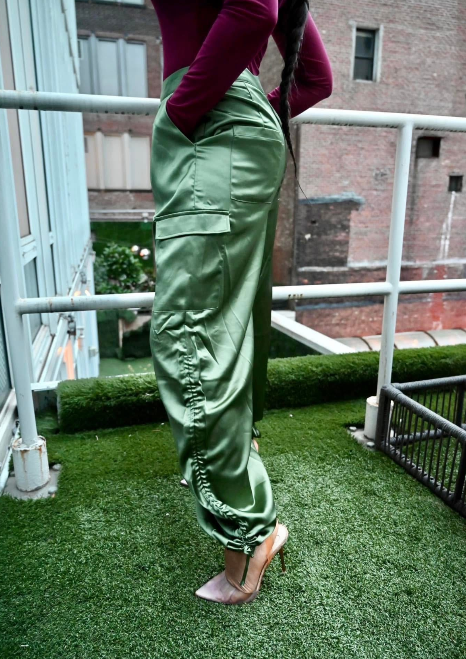 Satin Relaxed Cargo Green Pants